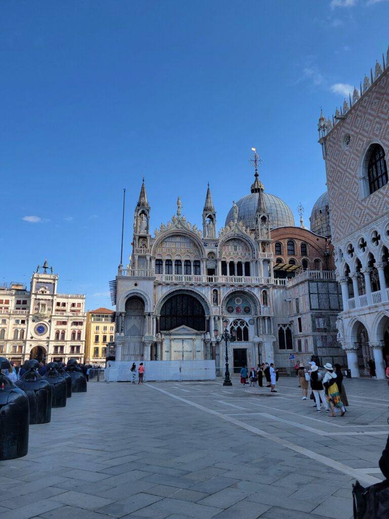 Once we returned to the main island, we ate dinner as a group under a beautiful green canopy. Let’s talk about a bit of culture shock. The number of courses at dinner were astounding! It was also another lesson in taking our time and enjoying our food and each other. This was when I had my first true Italian tiramisu. After dinner, we headed back to the hotel for some much needed rest. On the way we got a sneak peek of the Basilica di San Marco which is gorgeous!